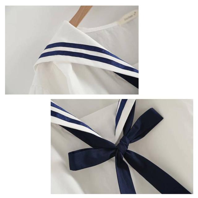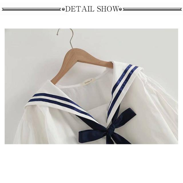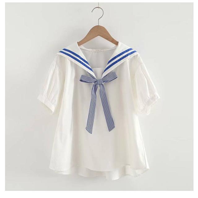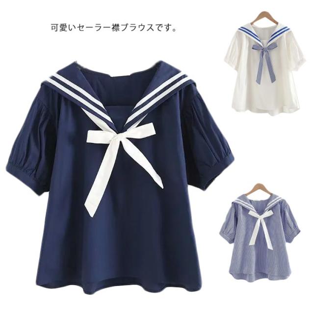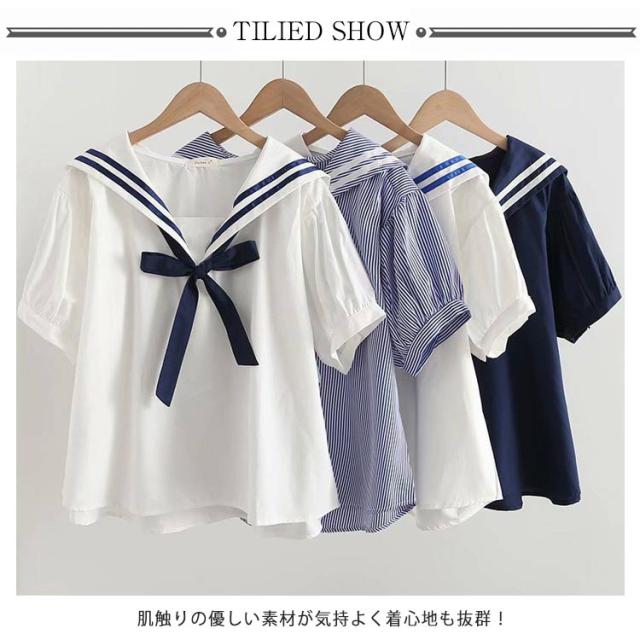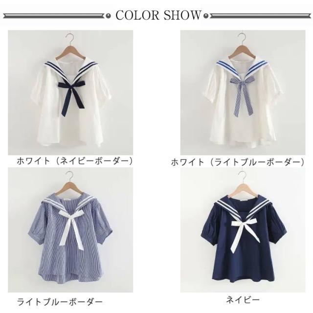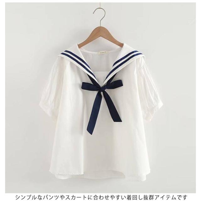送料無料 Tシャツ レディース ブラウス セーラー襟 五分袖 萌え セーラー風 リボン 夏 無地 学生風 かわいい カジュアル ゆったり お出かけ 通学 通勤