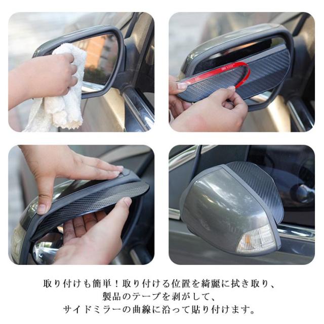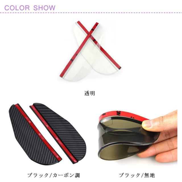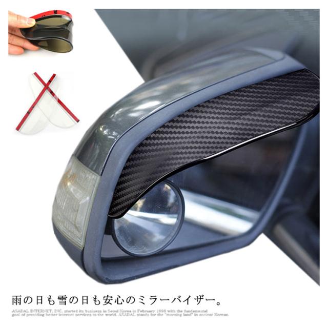 | 雨の日も雪の日も安心のミラーバイザー。 水滴対策にバッチリ!サイドミラーに付けるだけで、走行中もミラーが濡れず、雪も積もらないから、視界を確保し、より安全な運転をサポート! 柔軟性のある素材なので、様々な車種に対応できます。 上品でお洒落なカーボン調、合わせやすい万能の透明、シックなブラックの3色展開から選べます。 取り付けも簡単!取り付ける位置を綺麗に拭き取り、製品のテープを剥がして、サイドミラーの曲線に沿って貼り付けます。 超強力の3M両面テープなので、しっかり貼り付けます。 | |