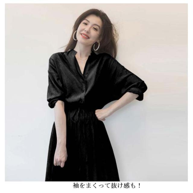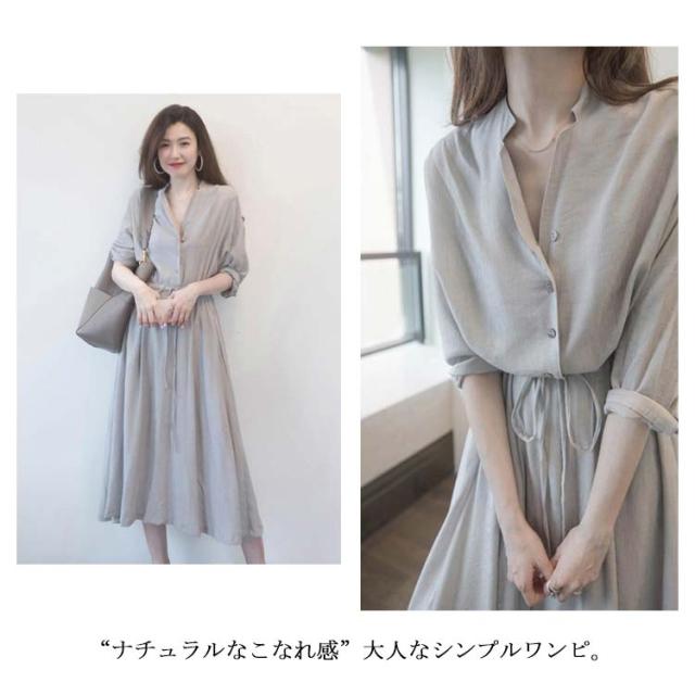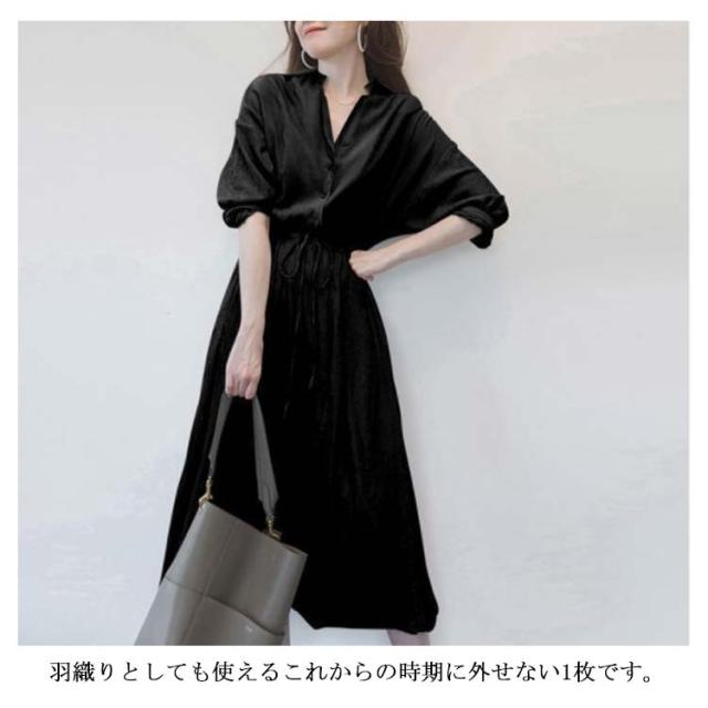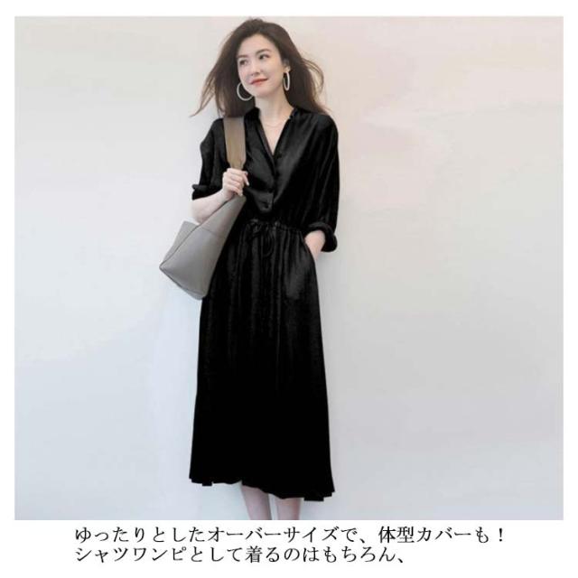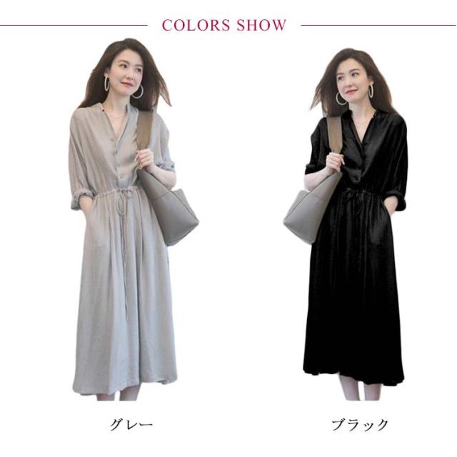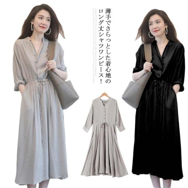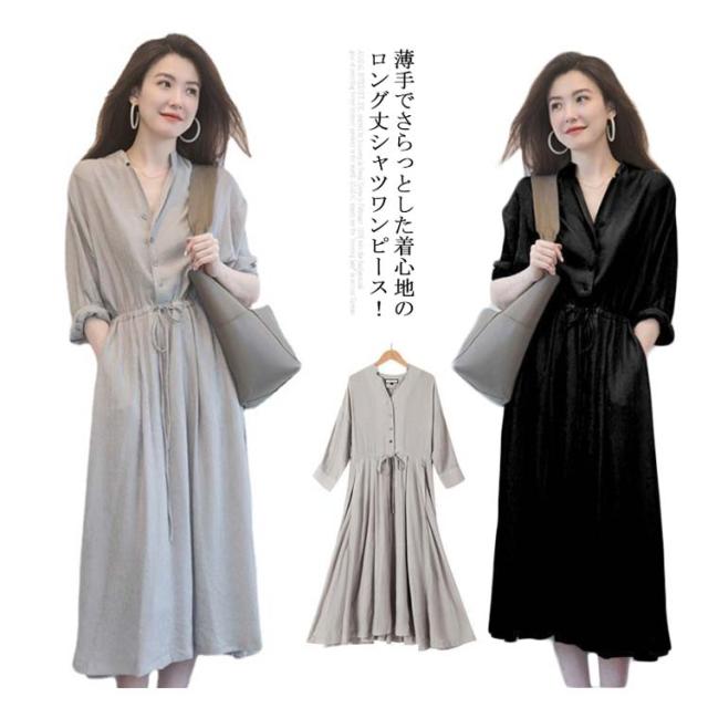 ワンピース レディース シャツワンピース 秋 長袖 ロングワンピース Vネック【送料無料】春夏秋 薄手 ミモレ丈 ロング丈 マキシ丈 無地 リボン付き Aライン カジュアル ナチュラル ゆったり