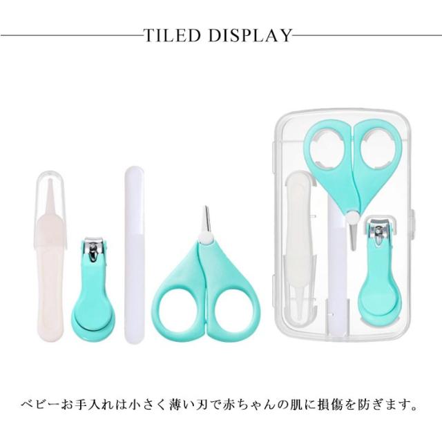 | 赤ちゃんのネイルお手入れ4点セット用品です。 ベビーお手入れは小さく薄い刃で赤ちゃんの肌に損傷を防ぎます。 爪切りの刃先は平らで、ふかづめを防ぎます。 細砂デザインの爪やすりは小さな爪を緩やかな丸みを帯びた形に仕上げることができます。 鼻用ピンセットの先端が丸いため、赤ちゃんにも安心してご使用いただけます。 | |
