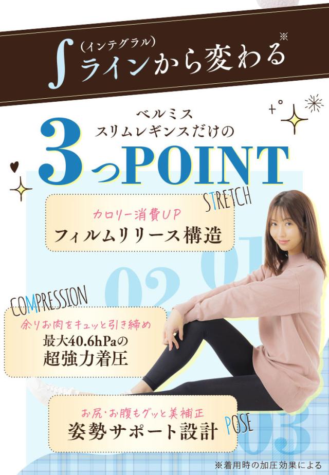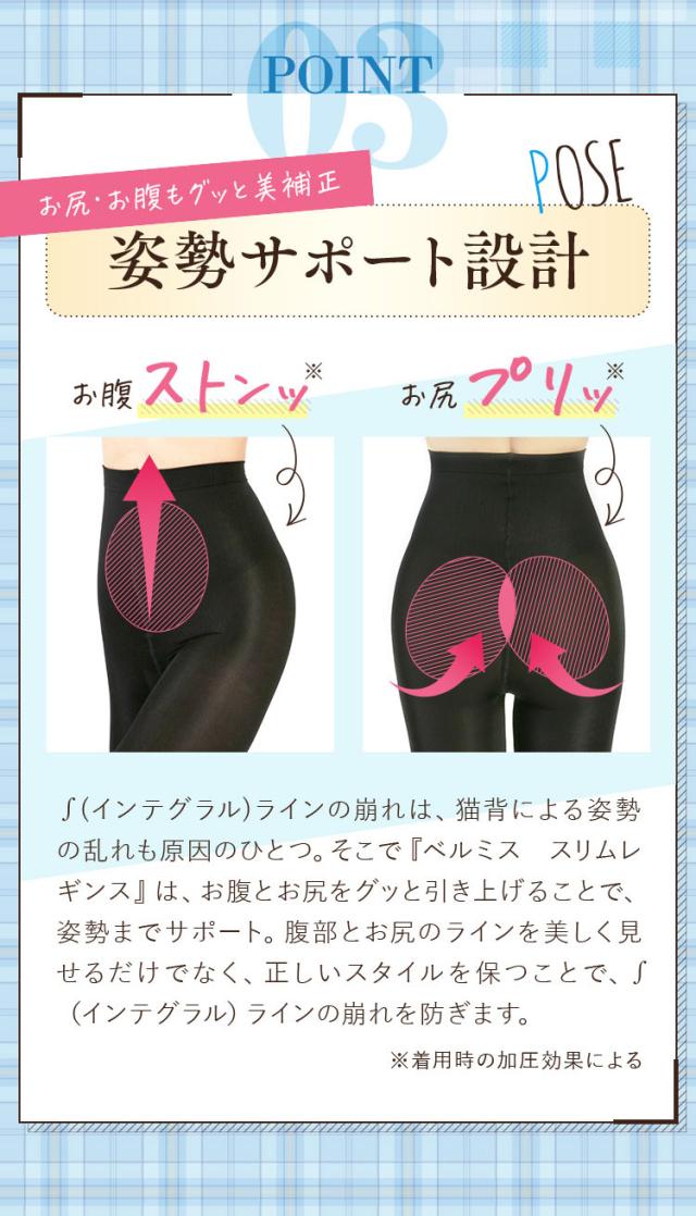 ・【スリムフィット形状?】 下半身はパーツごとに「適切な加圧度合」が存在します。ベルミスはこの加圧度合いに着目し、パーツごとに適した強度の加圧を実現!無理なく一番キレイに見えるシルエットを作ります。
