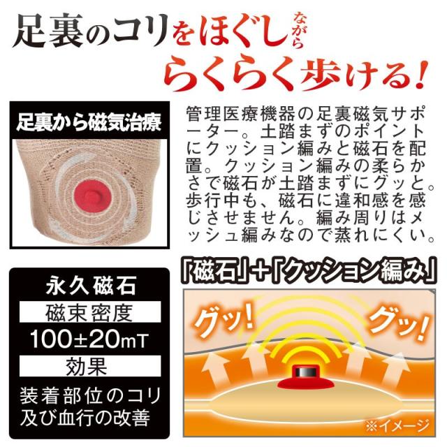| 商品説明 | 管理医療機器の足裏サポーター。足裏のコリをほぐしながらラクラク歩ける。土踏まずのポイントにクッション編みと磁石を配置。クッション編みの柔らかさで磁石が土踏まずにグッと。また歩行中、磁石に違和感を感じさせません。クッション編み周りはメッシュ編みなので蒸れにくい。指先は中足関節部分に着圧ラインを配置。横アーチを補整するので、らくらく歩行をサポートします。外反母趾対策にも!生地は爽快綿混なので気持ちいい。 |
