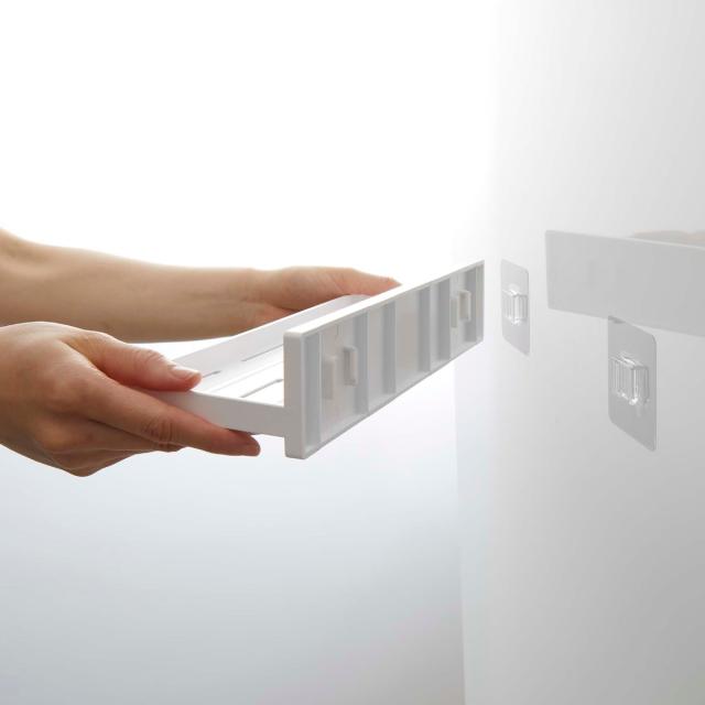 フィルムフックで貼り付けるトレー30cmです。毎日使うものを好きなところに設置して収納できます。また、浮かせて収納するから底がヌメらず衛生的です。