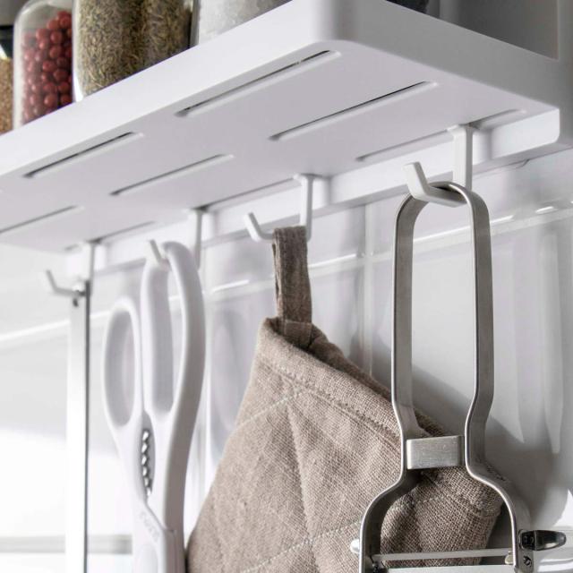 トレーの底にセットできるフックが4個付いてくるので、水まわりのブラシやスポンジ、キッチンツールなど掛けて収納したいアイテムもひとまとめにできます。