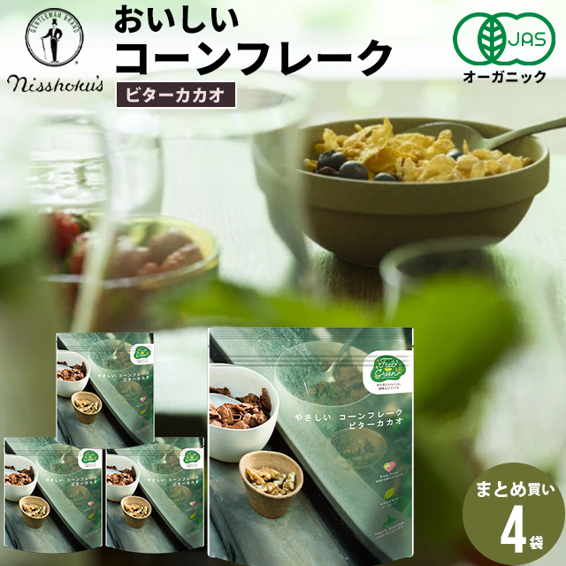 朝食 自宅用 まとめ買い 送料無料 日食 Feel&Green やさしい コーンフレーク ビターカカオ(140g×4袋) / 日食 フレーク コーンフレーク シリアル 味付き 朝ごはん 健康 ヘルシー ダイエット 食物繊維 栄養 まとめ買い 自宅用 一括購入