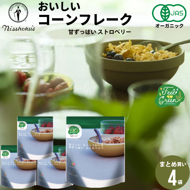 朝食 自宅用 まとめ買い 送料無料 日食 Feel&Green おいしいコーンフレーク 甘ずっぱいストロベリー(140g×4袋) / 日食 フレーク コーンフレーク シリアル 味付き 朝ごはん 健康 ヘルシー ダイエット 食物繊維 栄養 まとめ買い 自宅用 一括購入