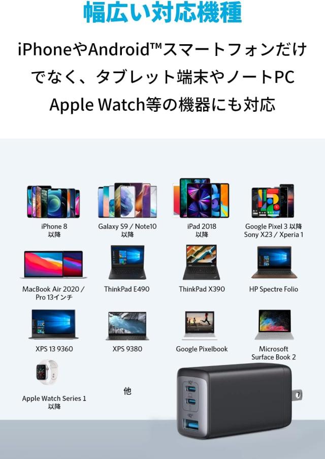 ・スマホ、タブレット端末、ノートPCの充電に、これ1つ:PowerIQ 3.0 (Gen 2) を搭載した2つのUSB-CポートとAnker独自技術PowerIQ搭載のUSB-Aポートを備え、合計最大出力は65Wの高出力。スマートフォンやタブレット端末からMacBook、USB PD対応のWindowsノートPCまでの幅広い機器を3台同時充電することができるため、機器毎に異なる充電器を持ち運ぶ必要はありません。※3ポート利用時の合計最大出力は64W