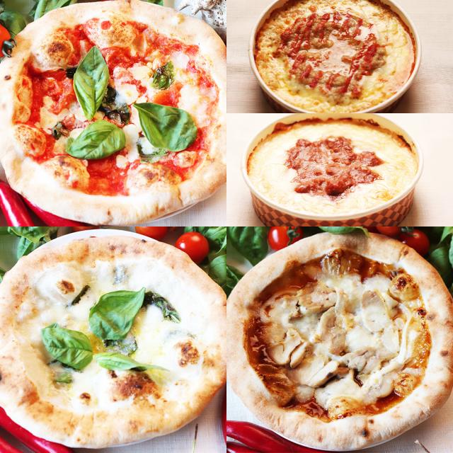 窯で焼き上げた本格ナポリピッツァ人気の3枚と手軽に楽しめる焼リゾット2種のバラエティセット。