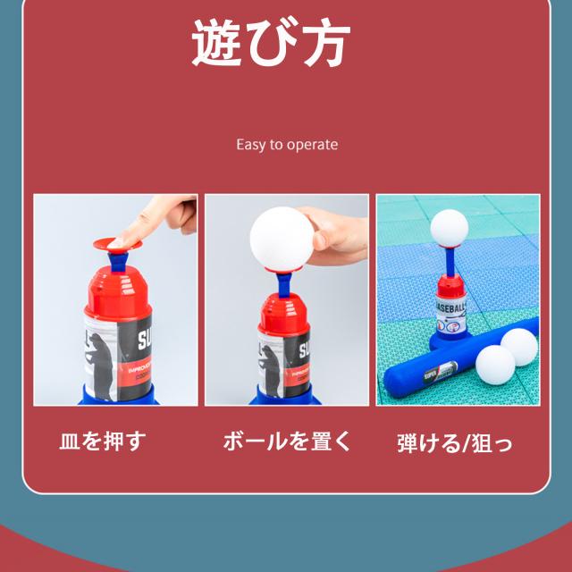 ・遊び方 ランチャー(発射台)にボールを置きます。数秒後ボールが自動で跳ね上がるので、それをバッティングするだけ!