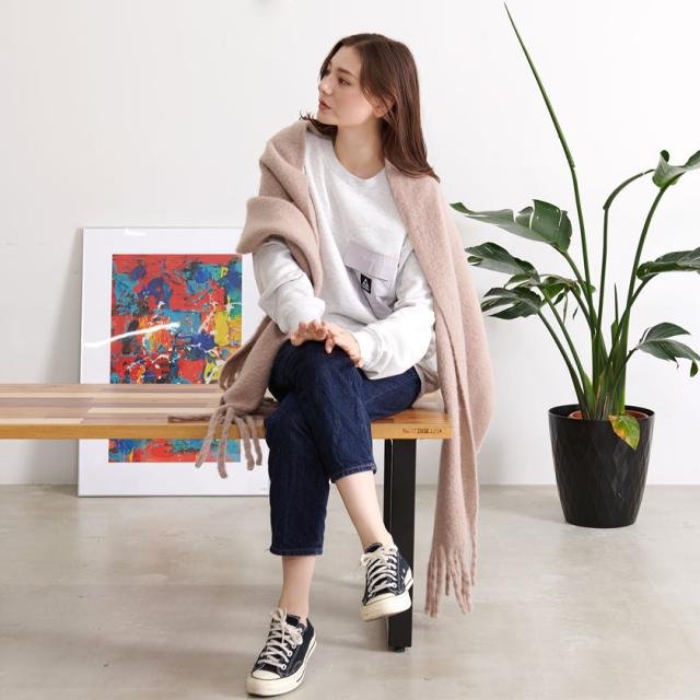 大判なので長さもボリューム感もたっぷりなのでストールみたいに羽織ったり結んだりできる、その日の気分やコーディネートにマルチに大活躍します。