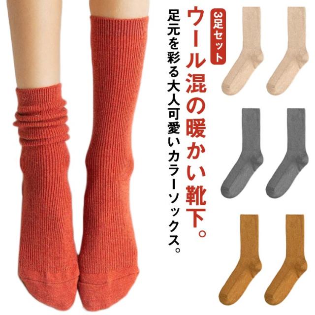 ウール混 ソックス 3足セット ハイソックス レディース リブ 靴下 締め付けない 秋 冬 暖かい 22.5-26cm 厚手 冷えない 防寒 送料無料 ロング 足冷え対策 保温 カラーソックス ロングソックス 学生 制服 革靴 ローファー スニーカー 普段着 お出掛け