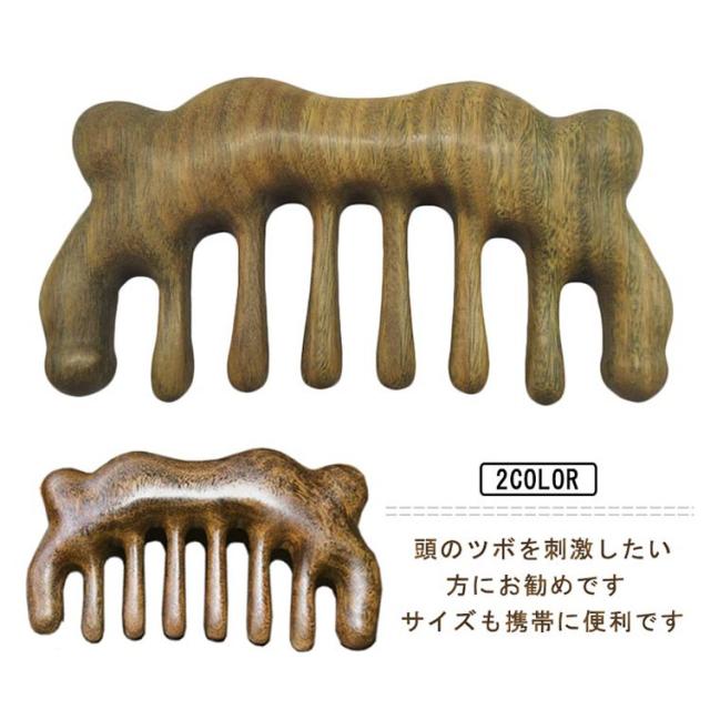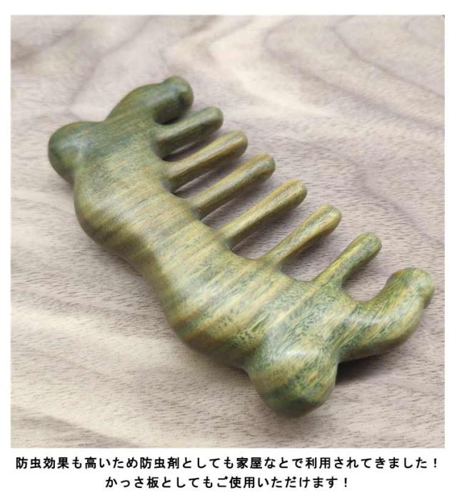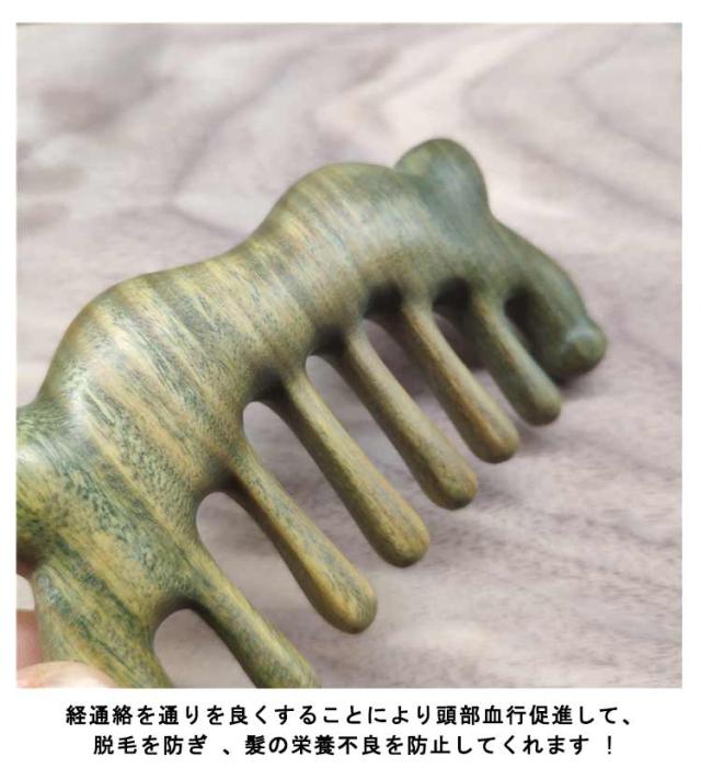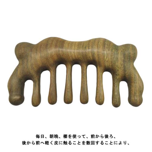 | 頭のツボを刺激したい方にお勧めです サイズも携帯に便利です 月日時間の経過が長ければ長いほど、緑になるということで「緑檀木」と言われているそうです! また香木の中でも、とても香りが良く、ほのかに甘い芳香を放ち、 気持ちを落ち着かせ、冷静な判断を実行する効果があるとも言われています! 緑壇木は、見た目よりもとても硬く、叩くと、コンコンと響きます! 防虫効果も高いため防虫剤としても家屋なとで利用されてきました! かっさ板としてもご使用いただけます! 毎日、朝晩、櫛を使って、前から後ろ、後から前へ軽く皮に触ることを数回することにより、 経通絡を通りを良くすることにより頭部血行促進して、脱毛を防ぎ 、髮の栄養不良を防止してくれます ! | |