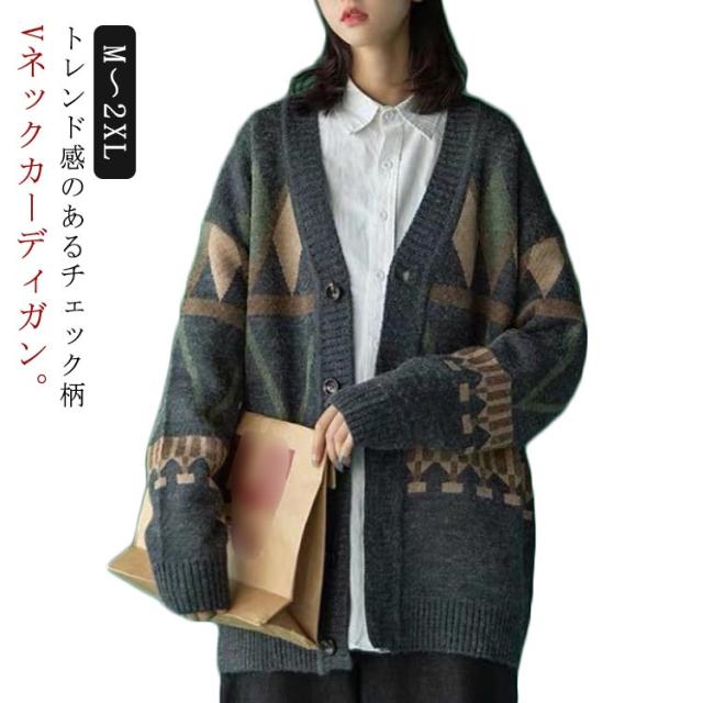 ニットカーディガン チェック柄 ロング カーディガン メンズ ユニセックス ペア 秋冬 トップス ニット 長袖 ニットカーディガン チェック柄 配色 送料無料