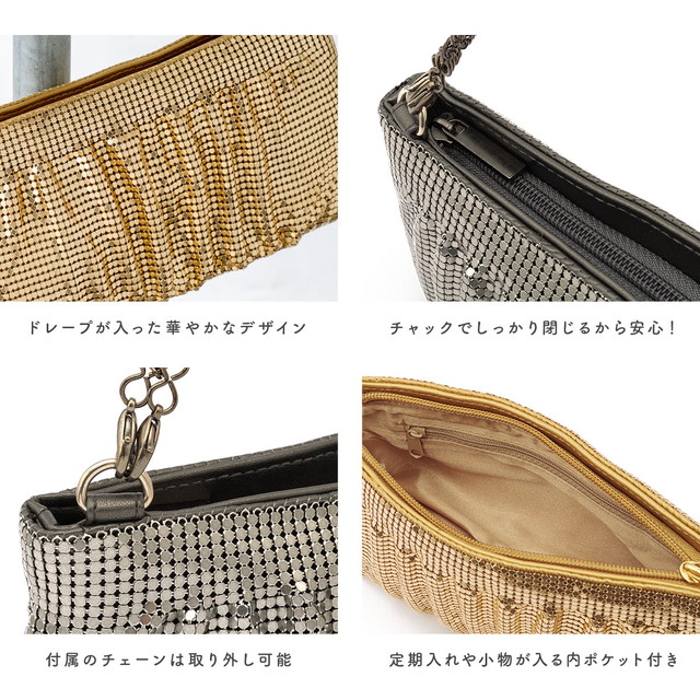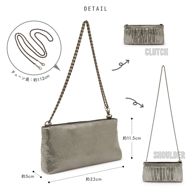 持ち手のチェーンは取り外しできますので、ショルダーバッグ・ハンドバッグ・クラッチバッグとしてお使いいただける3wayのデザインです。