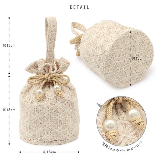 巾着の口は、フェイクパールが可愛い結び紐できちんと閉まります。