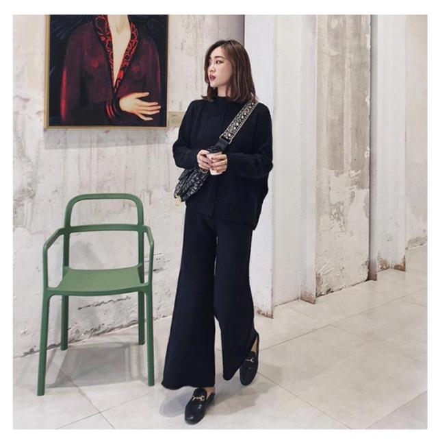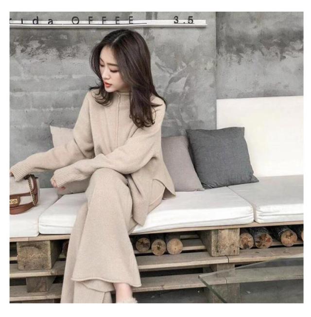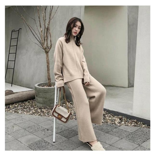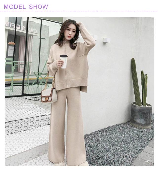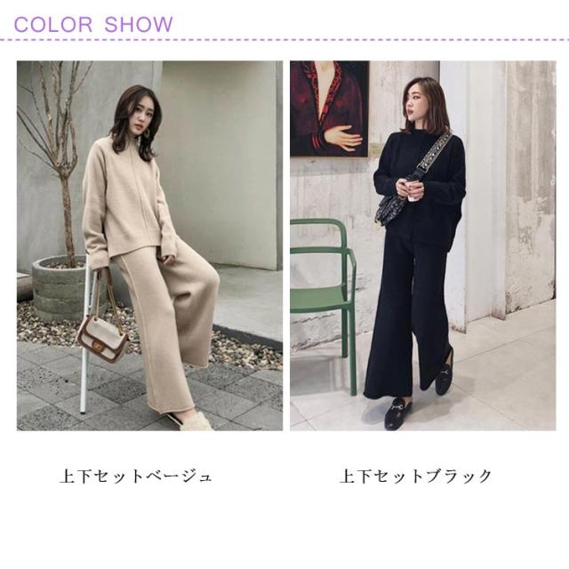 ニットセットアップ レディース ゆったり 長袖 タートルネック ハイネック スリット ニットトップス ニット パンツ ワイドパンツ セットアップ 秋冬 無地セーター カジュアル 韓国風 オシャレ