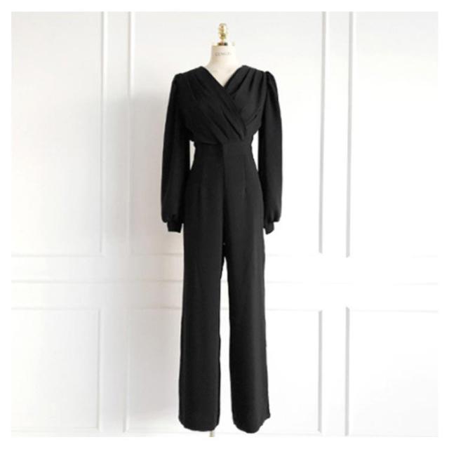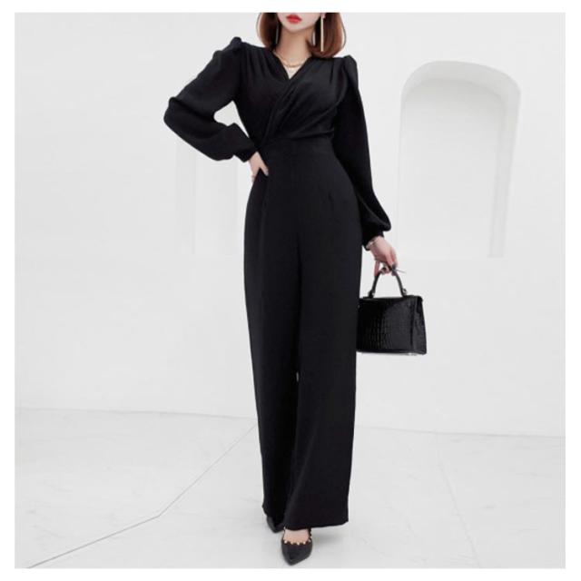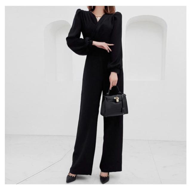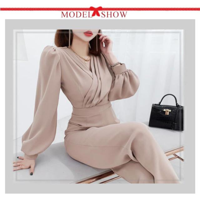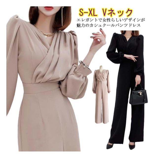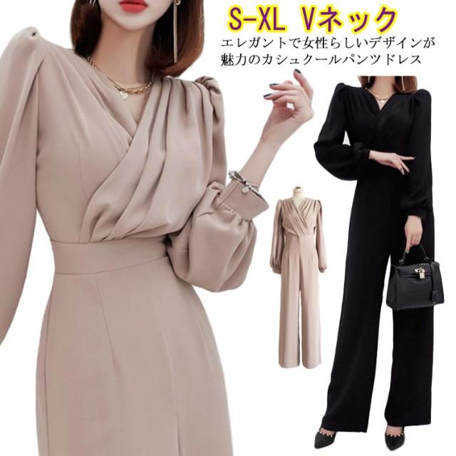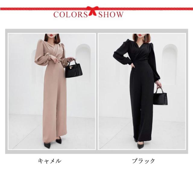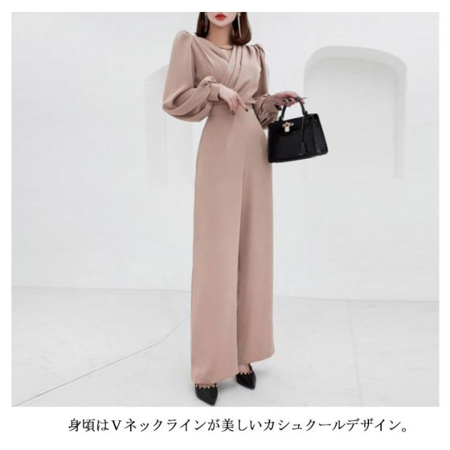 パンツドレス オールインワン ジャンプスーツ レディース 女性 長袖 Vネック カシュクールデザイン ボリュームスリーブ バックファスナー タック入り ハイウェスト 着痩せ 謝恩会 発表会 オケージョン パーティー デイリー 脚長 スタイルアップ 春 無地 全2色