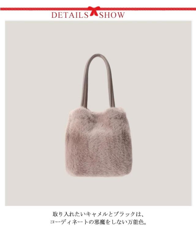 | 持つだけで秋冬のトーンを作り出せる、ほど良い存在感のファーバッグ。 取り入れたいキャメルとブラックは、コーディネートの邪魔をしない万能色。 もこもこのかわいさはコーディネートのアクセントとしてもGOOD♪ カジュアルでもオフィスにも使えるデザインです。 毛がふわふわで気持ちよくて、見た目もすごく可愛いです! | |