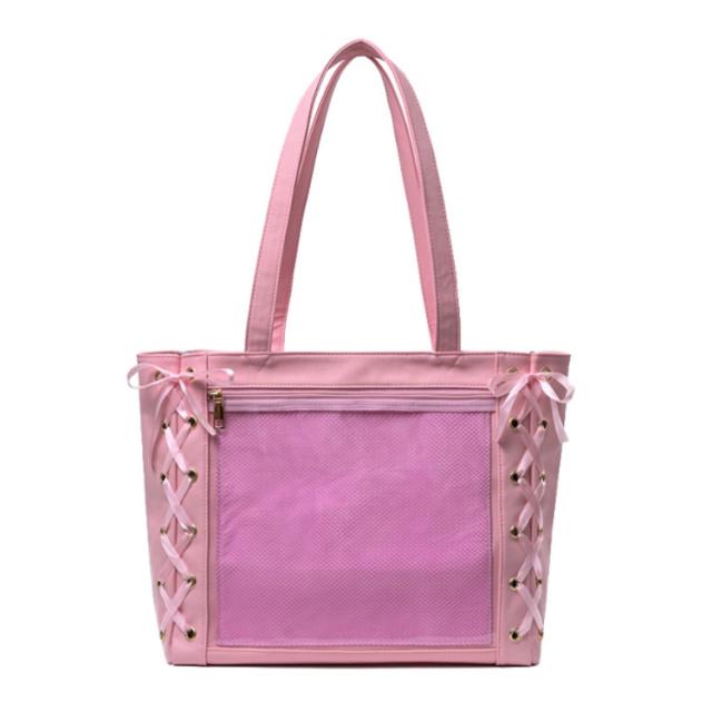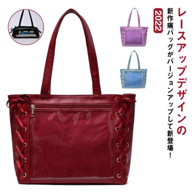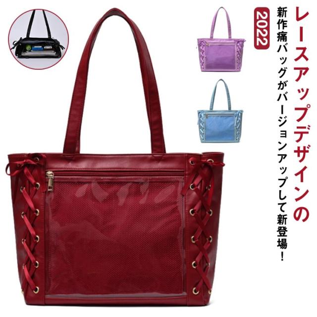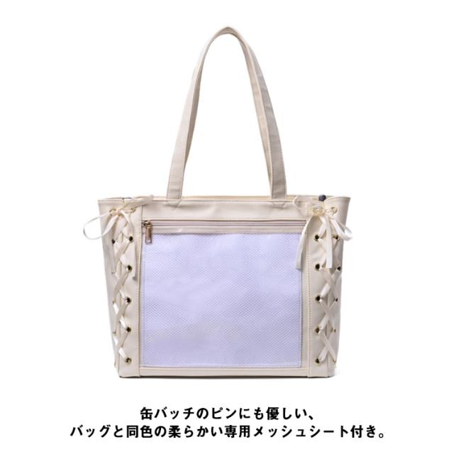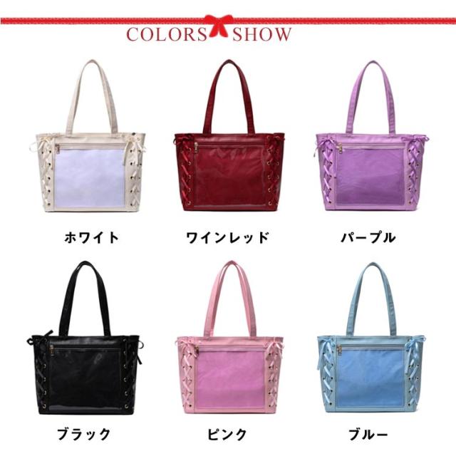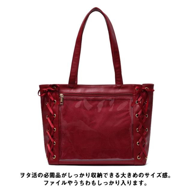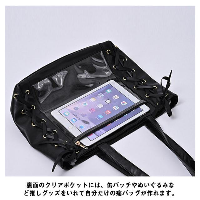 【送料無料】痛バ 痛バッグ トート レースアップ a4 大きめ 痛バッグ りぼん付き クリアバッグ 見せバッグ レディース 学生 大人 用 ライブ用 イベント用 推し活 レザー調 缶バッジ ぬいぐるみ かわいい 無地 黒 白