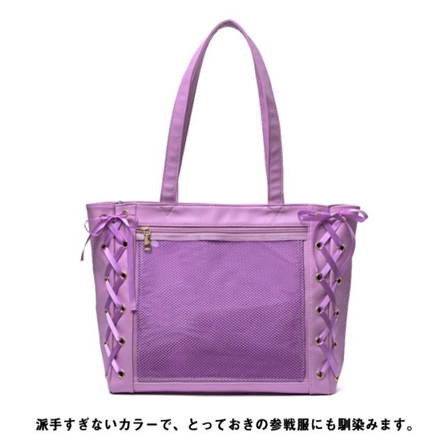 | レースアップデザインの新作痛バッグがバージョンアップして新登場!2022 裏面のクリアポケットには、缶バッチやぬいぐるみなど推しグッズをいれて自分だけの痛バッグが作れます。 缶バッチのピンにも優しい、バッグと同色の柔らかい専用メッシュシート付き。 内側にはポケットが2つあるため、なくしやすいリップなどの小物収納におすすめ。 ヲタ活の必需品がしっかり収納できる大きめのサイズ感。ファイルやうちわもしっかり入ります。 派手すぎないカラーで、とっておきの参戦服にも馴染みます。 | |