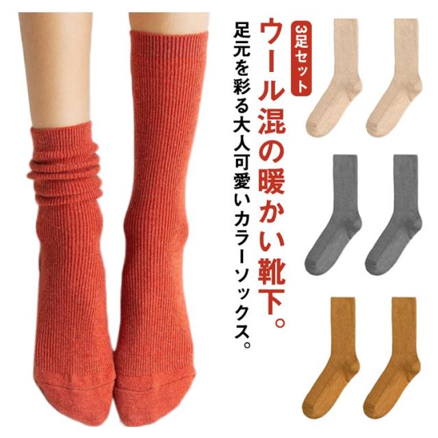 厚手 足冷え対策 3足セット ハイソックス ウール混 リブ カラーソックス 締め付けない ロングソックス 靴下 暖かい ソックス レディース 冷えない 防寒 送料無料 ロング 冬 保温 秋 22.5-26cm 学生 制服 革靴 ローファー スニーカー ウール混