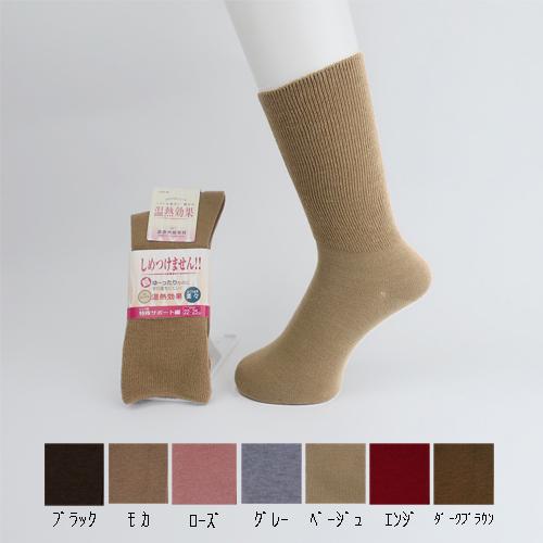 普通の靴下は一番上の部分でゴムを使って締めつけますのでふくらはぎ部分にゴムの後が付いたりしますがこの靴下はカカトの上付近からふくらはぎ全体の広い範囲でゆったりと締める構造の為、まるでしめつけ感が無いかのような、ゆったりした履き心地をお楽しみ頂けます。