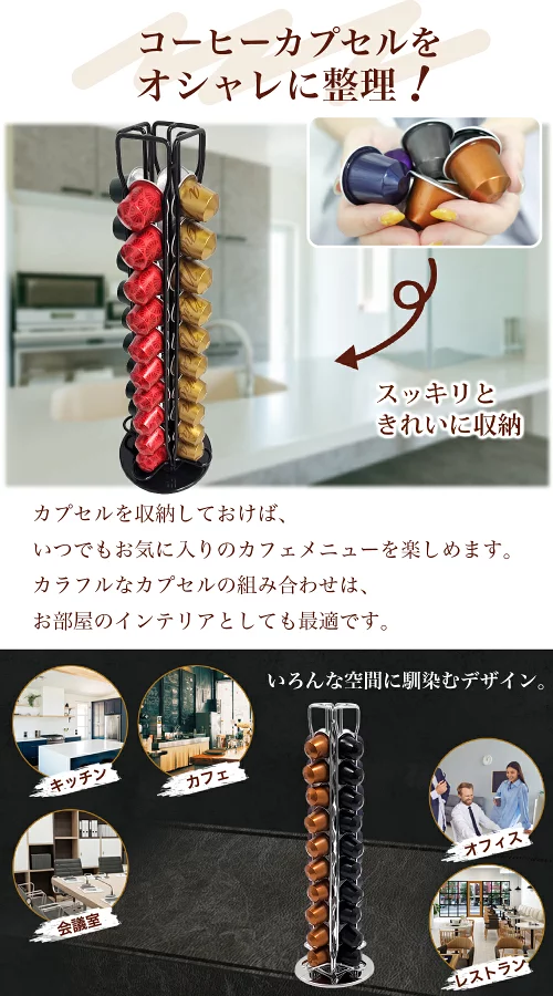 検索用:ネスレ ネスプレッソ カプセルホルダー 40個収納 カプセルケース カプセルストレージ ディスプレイスタンド 収納ラック 収納スタンド コーヒーカプセル収納 省スペース 収納 おしゃれ ラック タワー 回転式 カプセル 縦型 コーヒーnespresso coffee シルバー ブラック