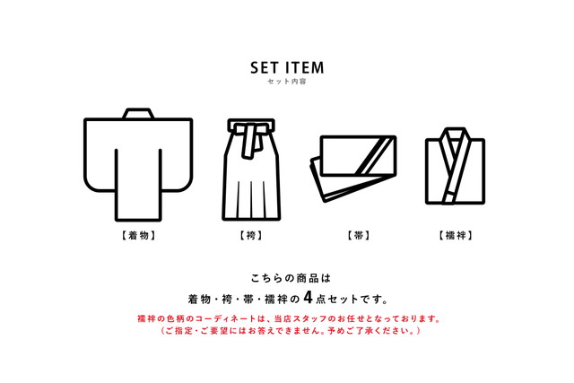 ※こちらの商品は【着物・袴・襦袢・下帯】のセットです。セット内容の一部変更や、それに伴う値引きは承っておりません。