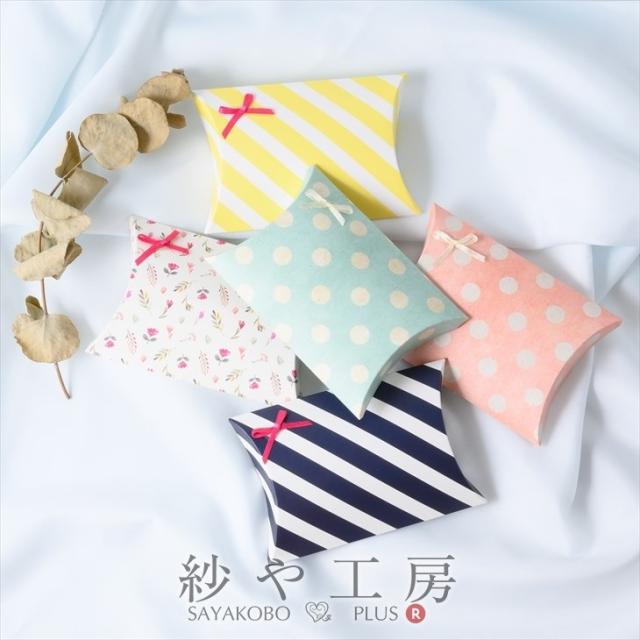 "小さめピロー型ボックスのギフトラッピングキットです♪手作りのアクセサリーを可愛くラッピングして、大切な方への贈り物をもっと特別に!OPP袋やセロパッキンなど梱包に必要な材料と、スタッフおまかせのサテンリボン付き♪ボックスは9種類からお好きなものをお選びください。【セット内容】