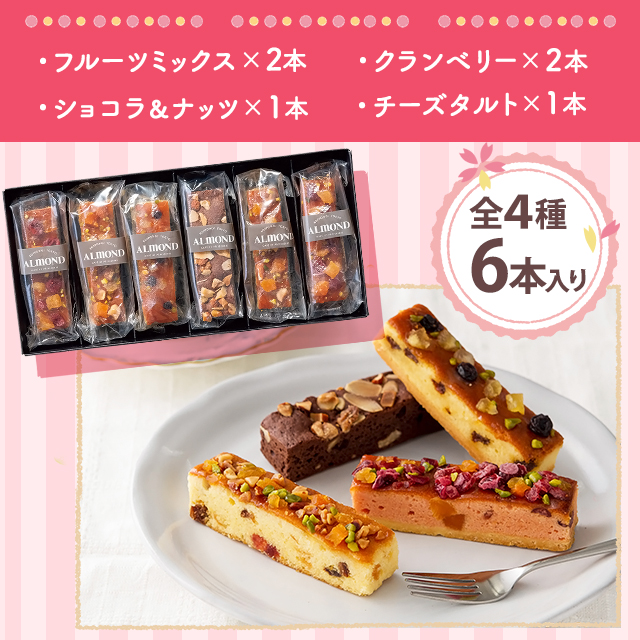 商品名 六本木アマンド ROPPONGI CAKE BATON<六本木ケイクバトン> 6本 容量 フルーツミックス、クランベリー×各2本、ショコラ&ナッツ、チーズタルト×各1本 原材料名 【ケイクバトン(フルーツミックス)】液全卵(国内製造)、小麦粉(国内製造)、マーガリン、砂糖、アプリコットジャム、フルーツ砂糖漬(砂糖、オレンジピール、レーズン、チェリー砂糖漬、水あめ、洋酒、パイン砂糖漬、レモンピール)、くるみ、はちみつ、ドライアプリコット、食塩、アーモンド、ピスタチオ、寒天/膨張剤、酒精、ゲル化剤(ペクチン)、乳化剤、酸味料、安定剤(増粘多糖類)、香料、酸化防止剤(V.E)、着色料(コチニール、カロテン)、漂白剤(二酸化硫黄)、(一部に小麦・卵・アーモンド・オレンジ・くるみ・大豆を含む)