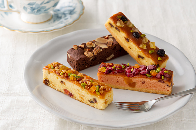 ・ドライフルーツやナッツでデコレーションしたスティック型ケーキです。