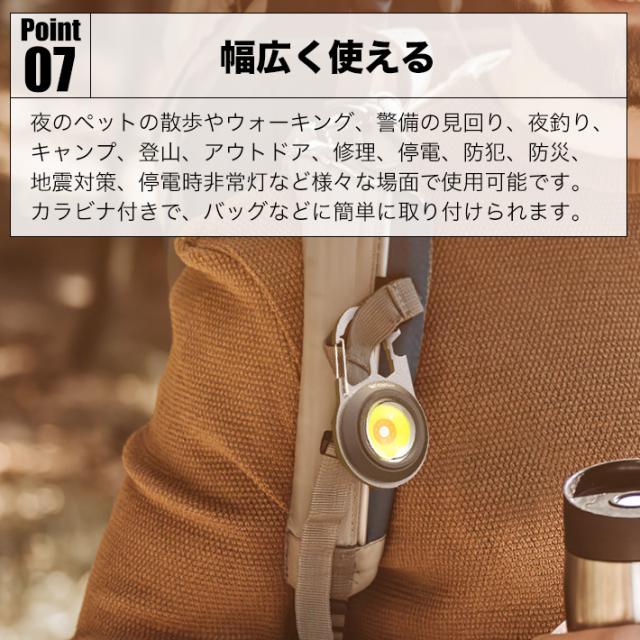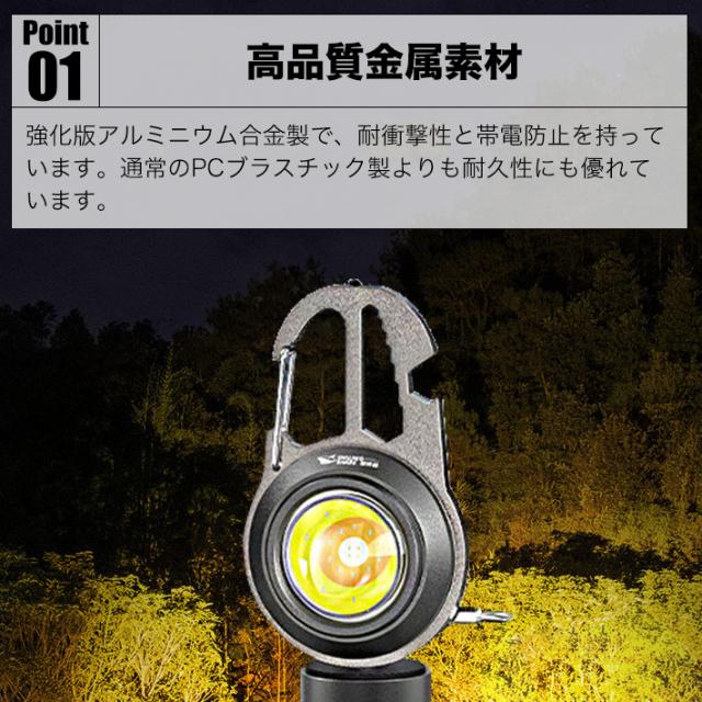 多機能COBライトはカラビナ付きで、キーホルダーやバッグに簡単に取り付けられます。栓抜きとしての機能も充実しています。また夜のペットの散歩やウォーキング、警備の見回り、夜釣り、キャンプ、登山、アウトドア、修理、停電、防犯、防災、地震対策、停電時非常灯など様々な場面で使用可能です。