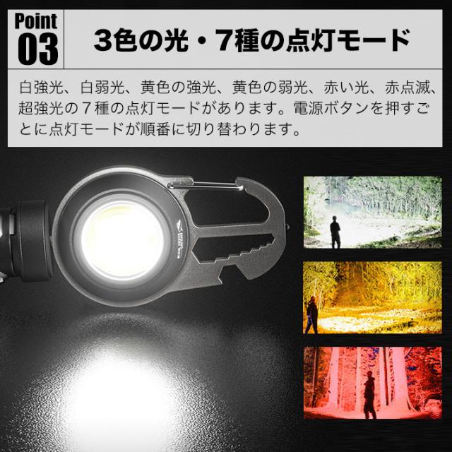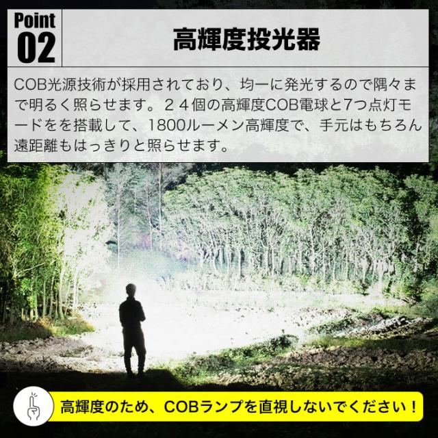 COB光源技術が採用されており、均一に発光するので隅々まで明るく照らせます。24個の高輝度COB電球と7つ点灯モードをを搭載して、1800ルーメン高輝度で、手元はもちろん遠距離もはっきりと照らせます。注意:高輝度のため、COBランプを直視しないでください。