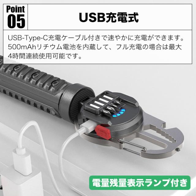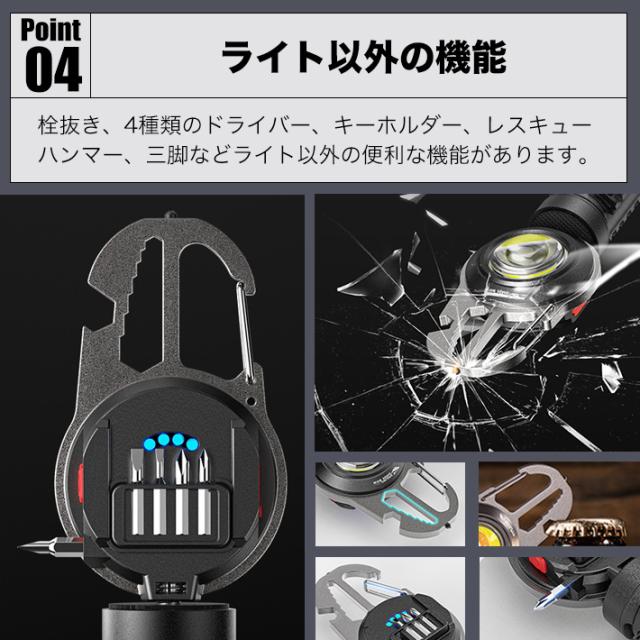 栓抜き、4種類のドライバー、キーホルダー、レスキューハンマー、三脚などライト以外の便利な機能があります。