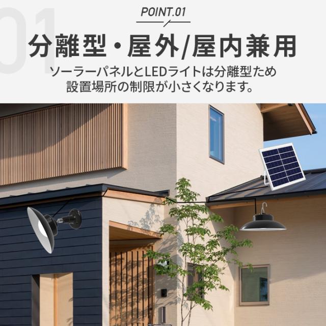 【分離型・屋外/屋内兼用・リモコン付き】ソーラーパネルとLEDライトは分離型の為、設置場所の制限が小さくなります。