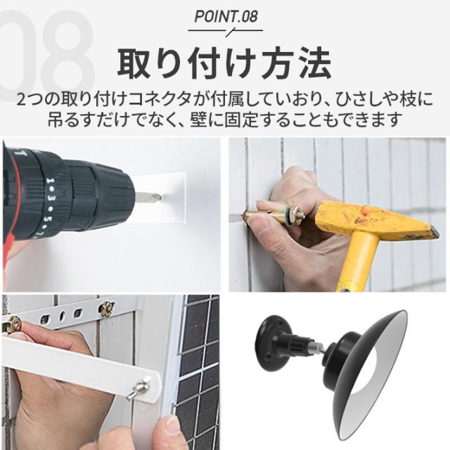 2つの取り付けコネクタが付属しています。ひさしや枝に吊るすだけでなく、壁に固定することもでき、安定性があります。