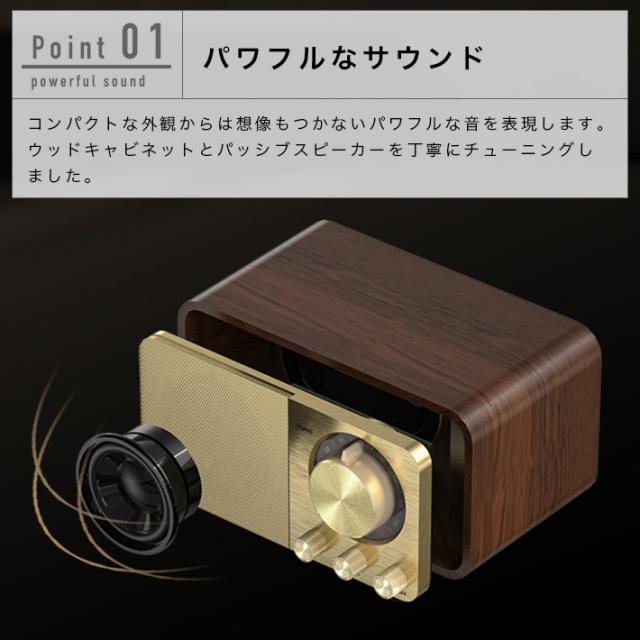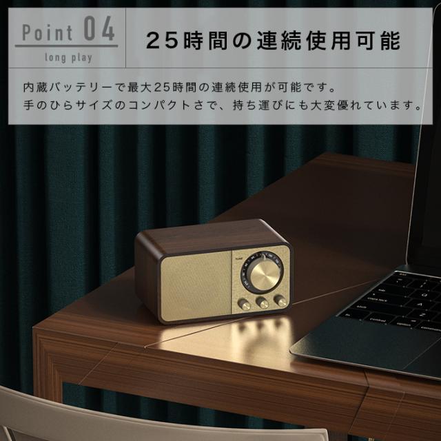 ウッドキャビネットのクラシックな外観とパワフルなサウンドが特徴のFMラジオ/Bluetoothスピーカーです。手のひらサイズのコンパクトさにもかかわらず内蔵バッテリーで最大25時間の再生が可能です。