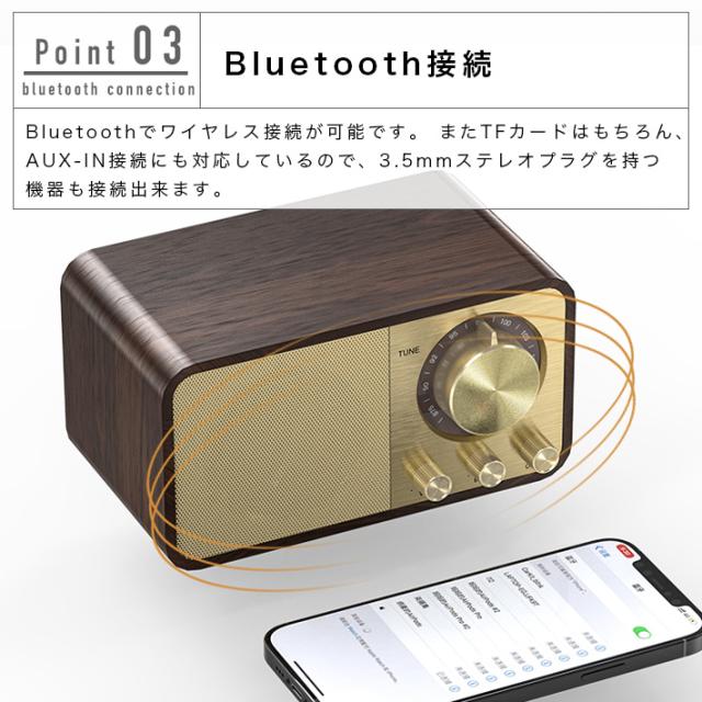 FMラジオ(ワイドFM対応)だけでなく、TFカードはもちろん、AUX-IN接続にも対応しているので、3.5mmステレオプラグを持つ機器も接続出来ます。さらにBluetoothでワイヤレス接続も可能です。