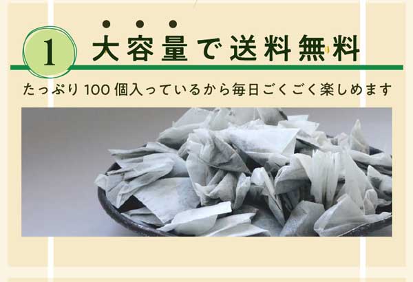- ティーバッグで片付けも簡単で、寒い季節に1日何度も飲むで100個入りで、助かります。薄く感じたら2個入れて、お茶を飲んでリラックスするようにしてます。