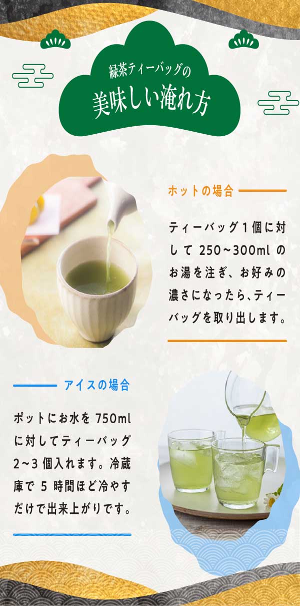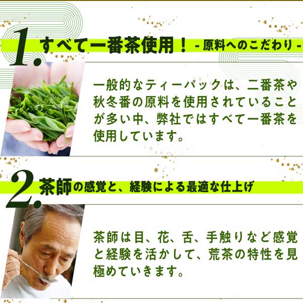 100%一番茶のみで作ったおいしい深蒸しティーバッグです。