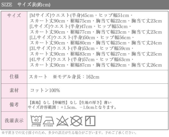■サイズ:[Mサイズ]ウエスト(半身)45cm・ヒップ幅51cm・スカート丈90cm・裾幅75cm・胸当て幅22cm・胸当て丈23cm [Lサイズ]ウエスト(半身)47cm・ヒップ幅53cm・スカート丈90cm・裾幅77cm・胸当て幅23cm・胸当て丈23cm [LLサイズ]ウエスト(半身)50cm・ヒップ幅56cm・スカート丈90cm・裾幅80cm・胸当て幅25cm・胸当て丈24cm [3Lサイズ]ウエスト(半身)53cm・ヒップ幅59cm・スカート丈90cm・裾幅83cm・胸当て幅27cm・胸当て丈25cm [4Lサイズ]ウエスト(半身)57cm・ヒップ幅63cm・スカート丈90cm・裾幅87cm・胸当て幅29cm・胸当て丈26cm
