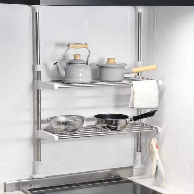 突っ張るだけの簡単設置で吊戸棚下に収納スペースを作れる、ステンレス製の突っ張りラックです。乾燥食材や調味料、小鍋やボウルなど、調理中に良く使う物を置いておけば、サッと手に取れて作業効率がアップ。布巾を掛けたり、お手持ちのフックを使って小物の収納に使ったりと、吊り戸棚下の空きスペースを有効活用して、使い勝手の良いキッチンを作れます。