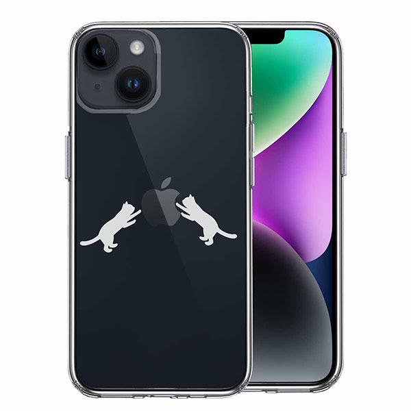 iPhone14 iPhone14Plus ケース ハードケース ハイブリッド クリア にゃんこ りんご 取り合い 薄いグレー カバー アイホン アイフォン スマホケース