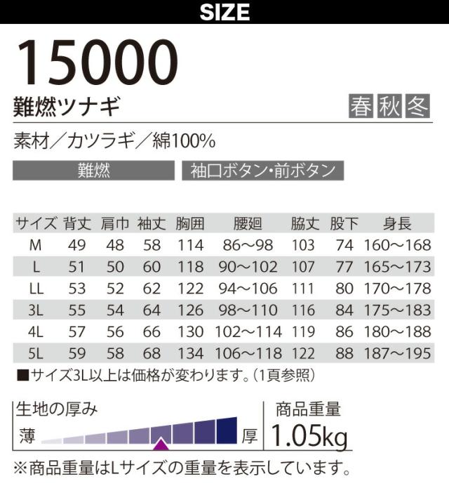 クレヒフク 難燃ツナギ 15000 M〜3L 綿100% プロバン加工 耐火性 袖口ボタン カバーオール つなぎ 続服 作業服 作業着 春秋冬 メンズ KURE