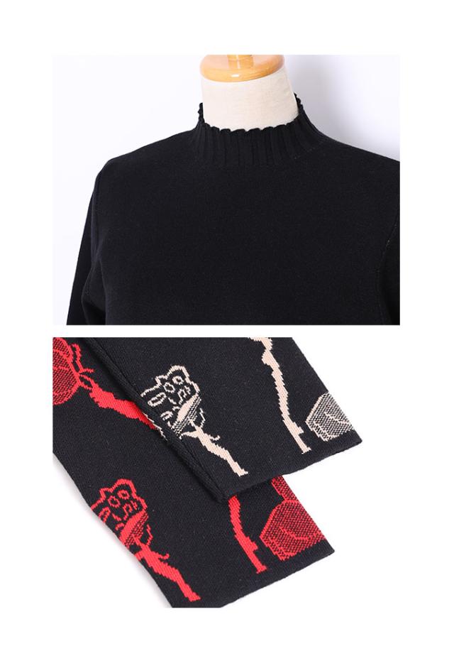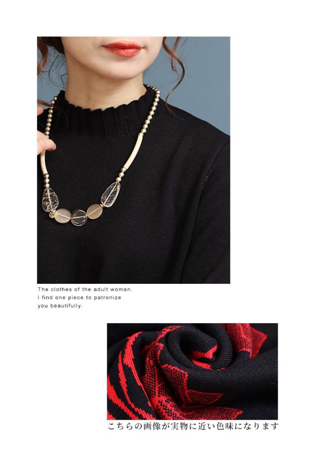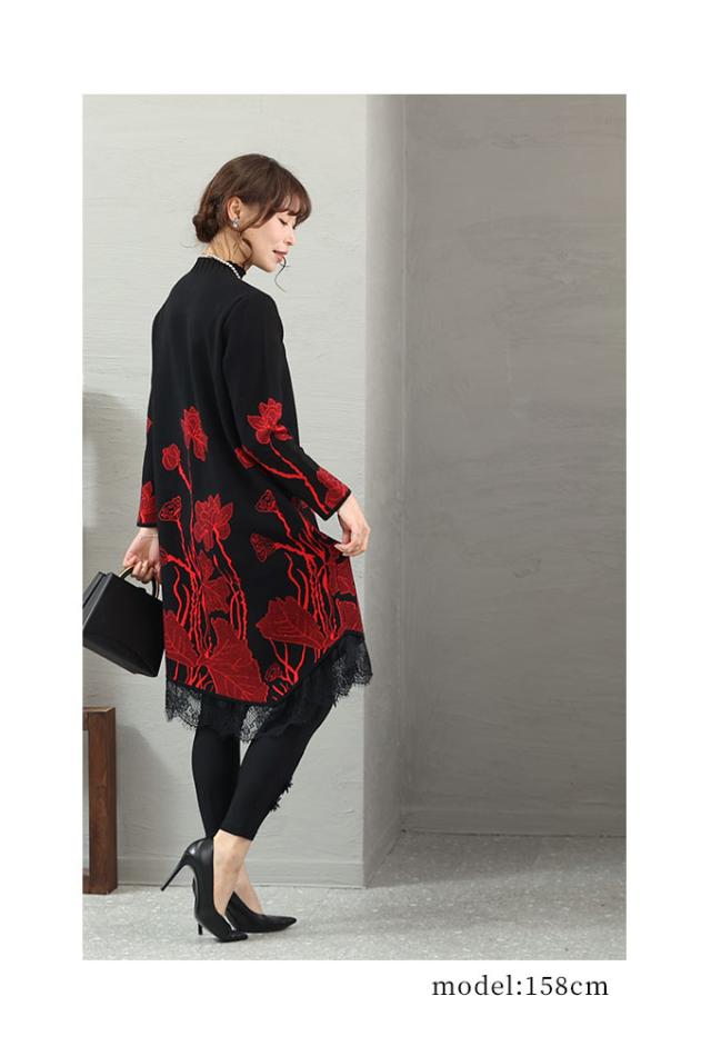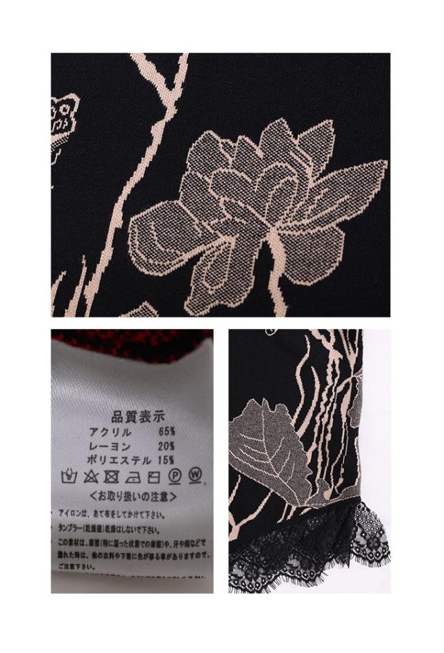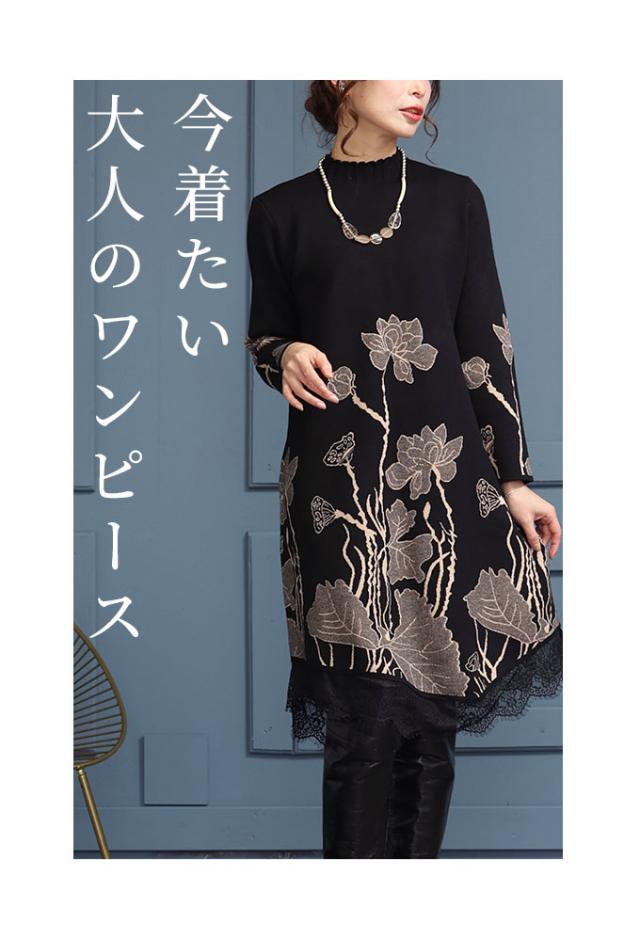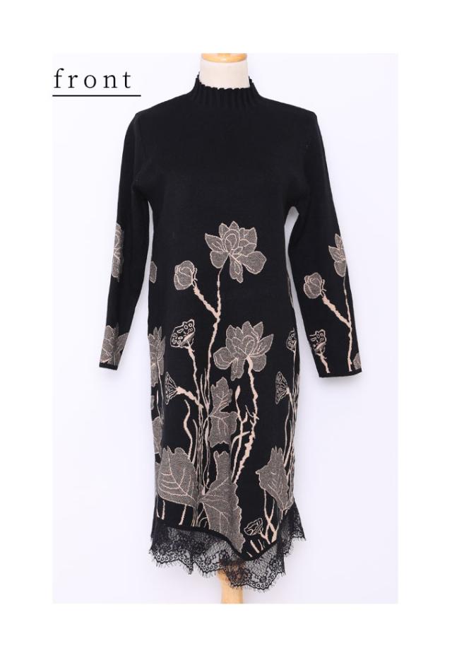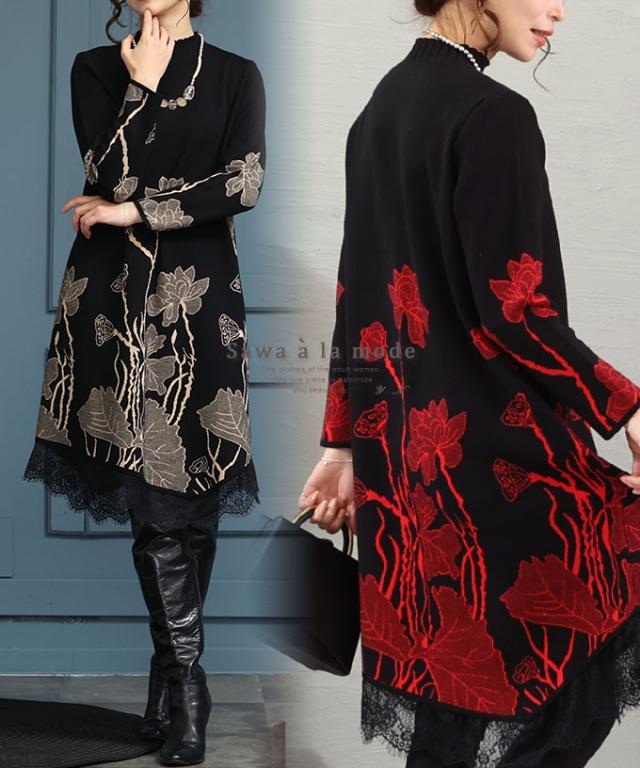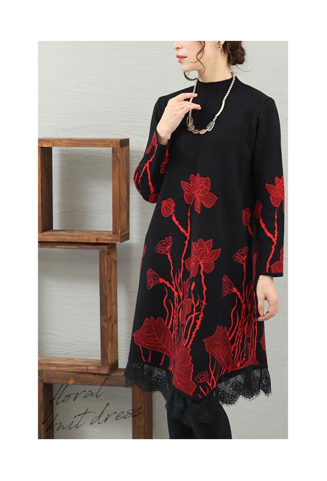 冬新作 草花立ち昇るレース付きニットワンピース レディース 長袖 ハイネック ボトルネック 膝丈 花柄 レッド 赤 ベージュ 春 春服 秋 秋服 冬 冬服 通年 30代 40代 50代 60代 サワアラモード sawaalamode otona 大人 kawaii 可愛い 洋服 かわいい服 mode-8211 あったか_f