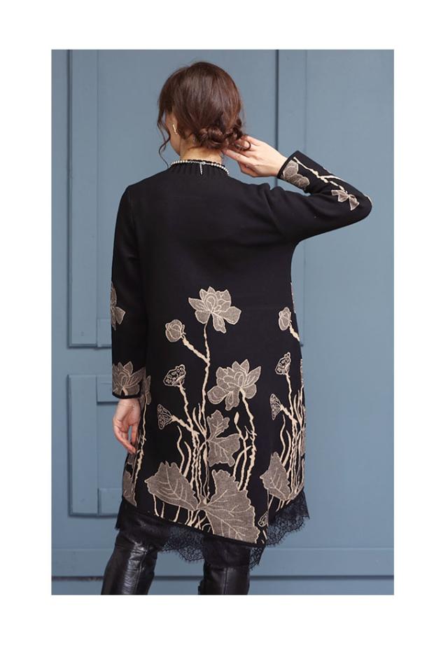 着丈は長い部分がふくらはぎにかかるくらいです。短い部分は膝下です。首元はプチハイネックで指が1本入る余裕があり楽に着用できました。身幅も脇ぐりも余裕があり楽に着用できました。ストンと落ちるシルエットで体型を拾わず楽に着用できました。裾がイレギュラーな丈でレースも付いていて女性らしく胸下からの花のデザインで脚長効果もありスタイルアップします。目の詰まった柔らかいニットで暖かく肌触りも良かったです