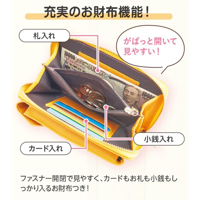 | 仕様 | ファスナー式開閉、カード入れ×4、札入れ×2、オープンポケット×2、ファスナー式小銭入れ×1、ホック式スマホ入れ×1 |