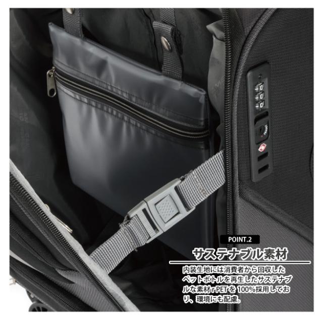 「MAXWELLL(マックスウェル)」は、スクエアなシルエットと、底面の重心を低くすることでより広いスペースを確保した、『収納力』が特徴のソフトケースコレクションです。 フロントオープニングタイプ仕様で、パッキングのしやすさはもちろん、スーツケースを立てた状態や、限られたスペースでも荷物を楽に取り出すことができます。 ※こちらの機内持込サイズにはエキスパンダブル(拡張)機能はございません。