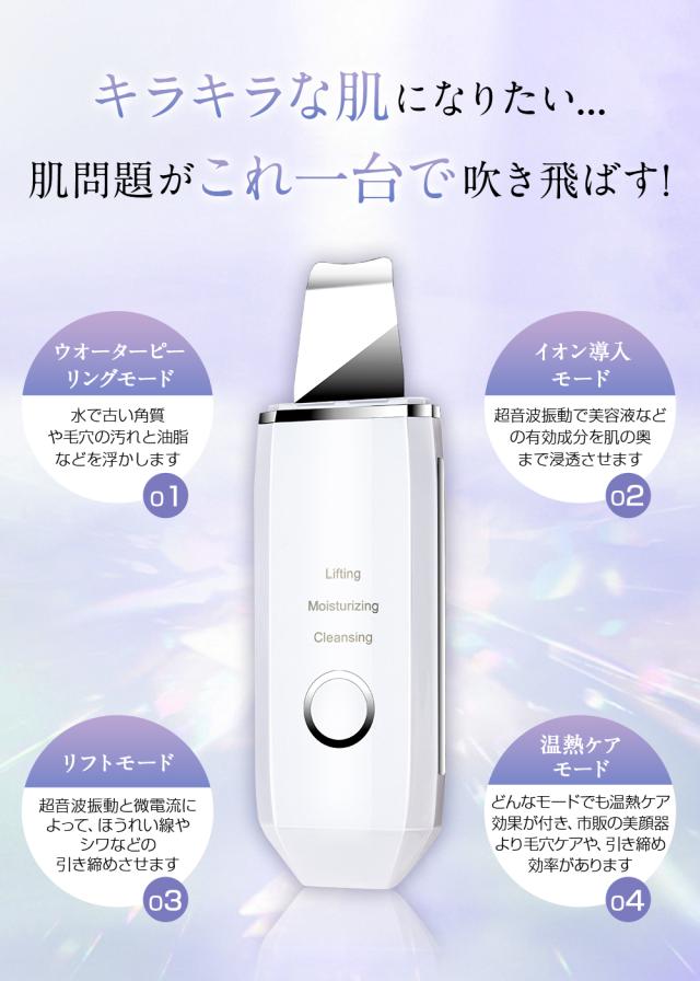 ウォーターピーリング 美顔器 超音波 ウオーターピーラー EMSマッサージ イオン導入/出 毛穴ケア IPX5防水 黒ずみ ニキビ