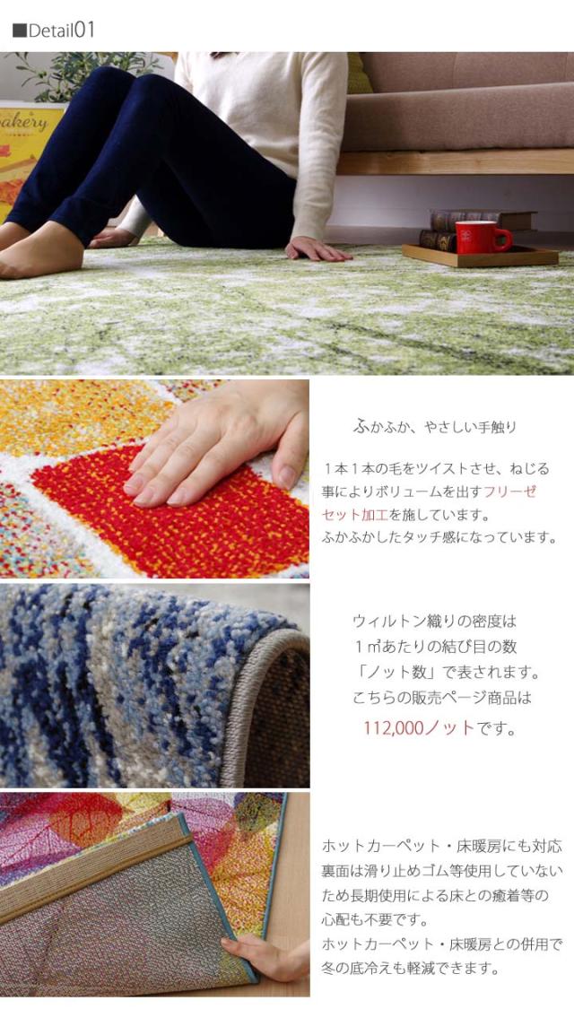 | 組成 | 素材:ポリプロピレン100% 112,000ノット ※フリーゼセット加工 ※パイル長約9mm ※洗えません |